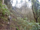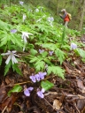 さて七座山はリーダーによれば「小学生の遠足の山」ということである。階段、道標などが整備されているが今朝までの雨で泥濘み、尾根まで電光道があるが東斜面は急で滑ると怪我をしかねなかった。その代り登山路の両脇には白や青のキクザキイチゲやスミレサイシンが行列し、秋田杉の大木が聳えていた。また宗教遺跡への道も分岐していたが脇目もふらずに尾根に向かった。