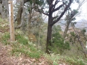 さらに芝座、三本杉座、大座を通った。計画書にあった東斜面への下山口もある。覗くと岸壁の間の急斜面に踏み跡がくだり、濡れた路面で滑るかもしれないと尾根を北に向かった。松座にはベンチがある。一休みして七座山の尾根を振り返ってみた。尾根は米代川の蛇行に並ぶように>字型になっているようだ。米代川の向こうに聳えるのが権現座のように思えたが・・・・