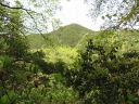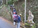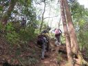 更に登って行き、上を見ると崩れ落ちた家屋の傍に鳥居が立つ金毘羅神社に着きましたが、宮社は右に上ったところに建立されていました。宮社に詣でてから元の道に戻り、左右切り立った道を登り続けます。本来なら緊張した気持ちを和らげる「イワウチワ」も残念ながら時期が終わっていました。