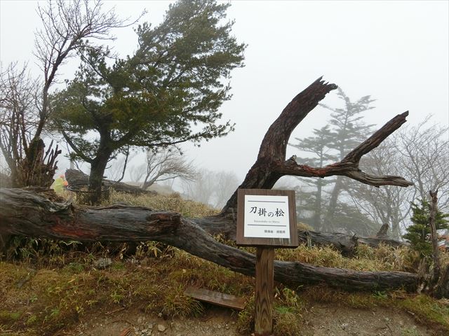尾根道から山頂に往き、大剣神社を通って下山する剣道の周回コースにしました。10分ほどで刀掛の松に到着。頂上ヒュッテは素通りして