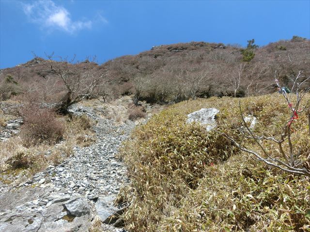 樹林帯を抜けるとガレ場になり、ここは歩きにくいです。山頂直下に池がありました。
