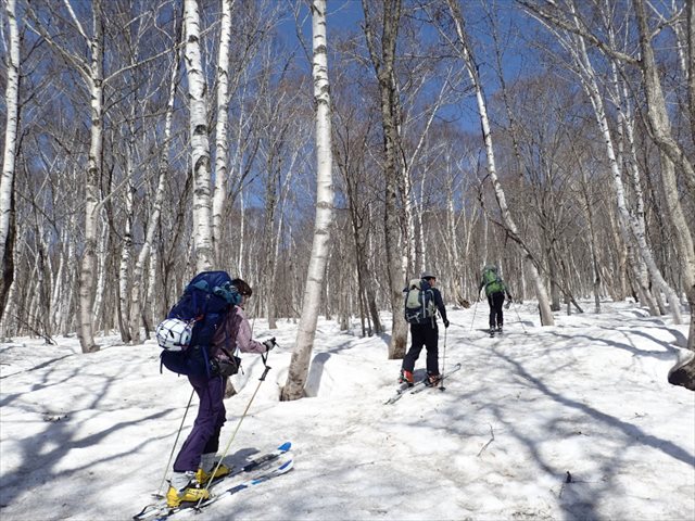 ダケカンバの林の中をシールで進みます