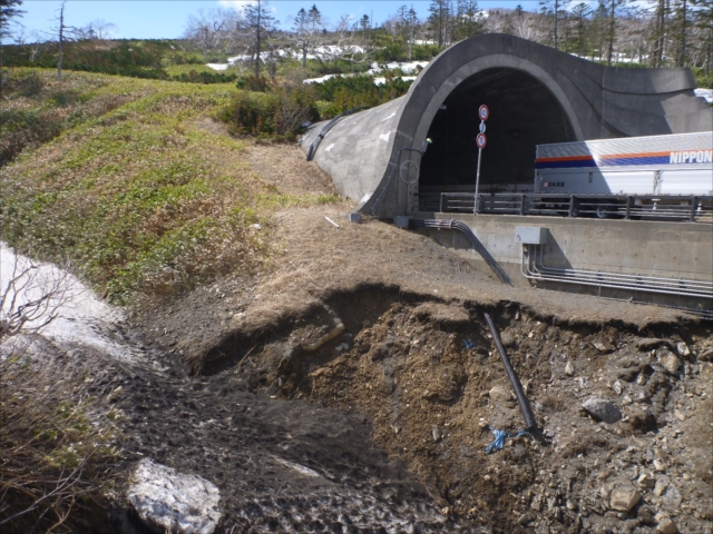 日勝トンネル出入り口には雪がなく笹薮が