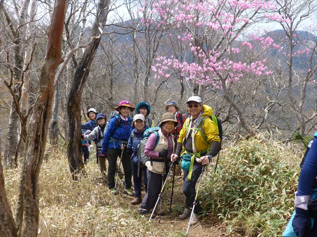アカヤシオをバックに 二班です