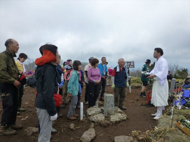 釈迦ヶ岳山頂に到着! 開山祭に出くわし宮司さんから説明を受けます