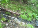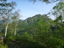 最初の水場である冷水ノ沢(標高950m)で一休みする。塩ビパイプから勢いよく水が飛び出していた。周りの林はアカエゾマツとダケカンバが目立つ。約10分で第2の水場である前岳の沢に着いた。こちらもソコソコの水量だ。斜面にダケカンバの白肌が映える道を登ると尾根に出て馬の背コースとの合流点についた。