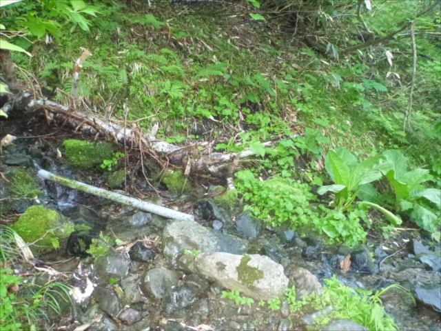 冷水沢水場を示す塩ビ管からトウトウと