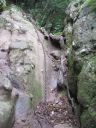 銅鳥居に一礼して鳥居をくぐった。参道の石段を登って英彦山神宮(奉幣殿)へ、ここから先が山らしくなった。少し急になり尾根道を歩くと、鎖場が5、6ヵ所あったが、高度感もさほどなく楽しく歩けた。木立に囲まれ曇っていたので、展望は、あまり良くなかったが、中宮から行者堂を過ぎた辺りで森の貴婦人・オオヤマレンゲを見たときは嬉しく、自分一人で楽しむのは勿体なかった。英彦山神宮(上宮)中岳から英彦山山頂に向かい休憩所で昼食をとった。ここで引き返そうとも考えたが、三角点好きの私にとって、やはり南岳まで行きたくなる。ちょっと急な道を歩いて、南岳まで足を伸ばし満足した。