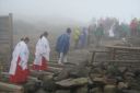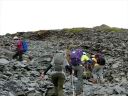 ここでお昼を食べ、シラビソの林を歩きオーレン小屋へ。 ここから峰の松目に行く予定でしたが、ガスで景色は見えないのでそのまま夏沢峠へ。 一瞬、これから登る硫黄岳への急登が見えカラフルなザックの列が動く。