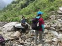 朝ゆっくりの出発で問題ない、とリーダーが言うので、各自好きな朝食を取り、8:35に徳沢を元気に出発!(←その時はまだ元気でした (-_-;) いくつか橋を渡り、ゴロゴロした岩を歩いて中畠新道分岐に到着。