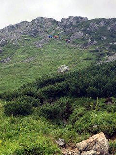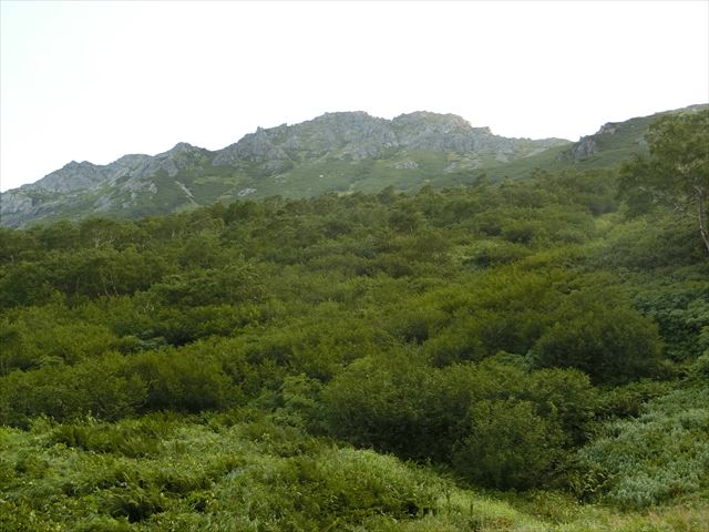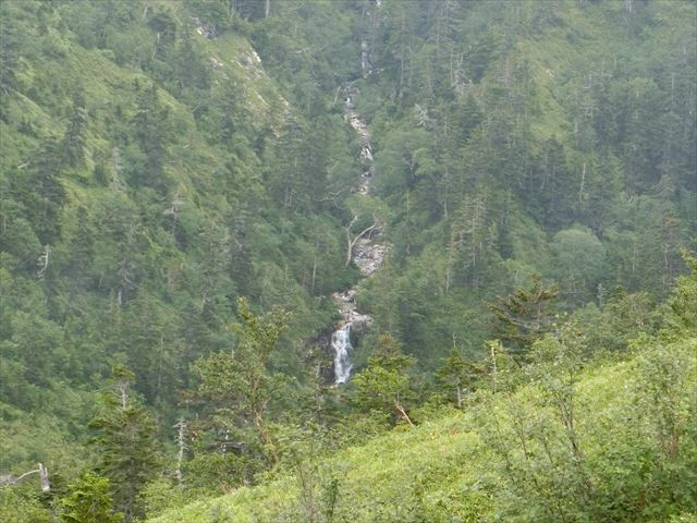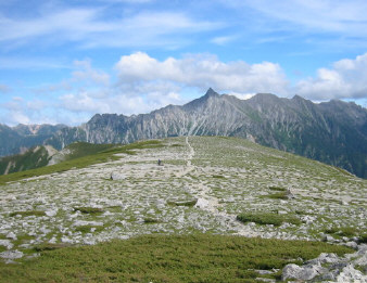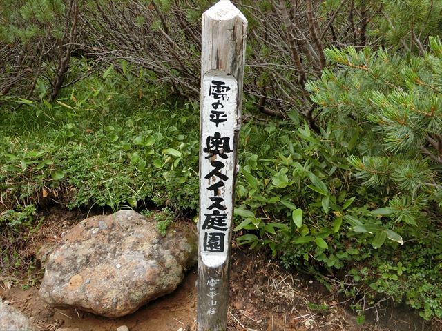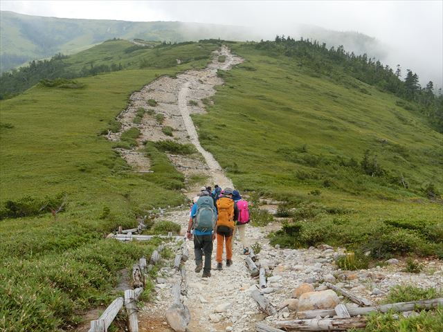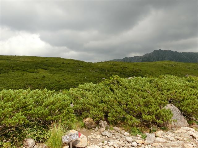 小屋を6時少し前に出る。いつ降りだすかわからない空模様なので、雨具を付け出発。双六小屋の広いテント場を過ぎると、すぐ急登が始まった。登山道の両脇は、はい松が一面に生え濃い緑に染まる。稜線に出るが遠くの風景は見えない。