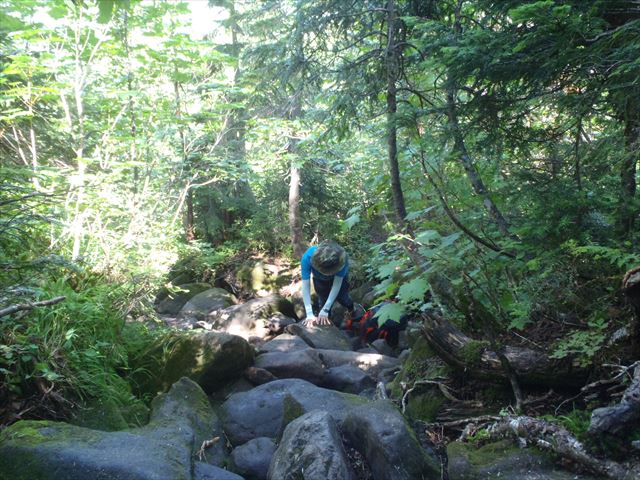 ここから雲ノ平への道はかなり急登。石・岩がゴロゴロ、木がうっそうとしているので黙々とあるきます。急坂をこえると少しずつ視界が開けてきて木道歩きになります。