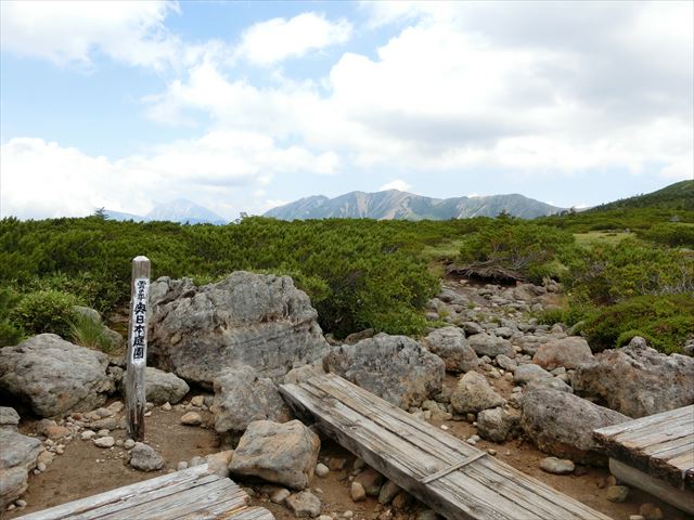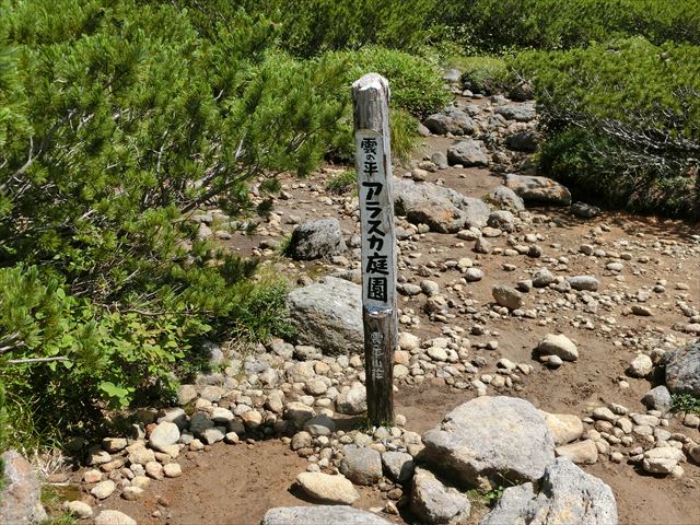最初にでてきたのは「アラスカ庭園」ベンチもあり、薬師岳を見ながらここで大休憩。