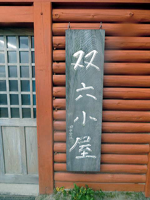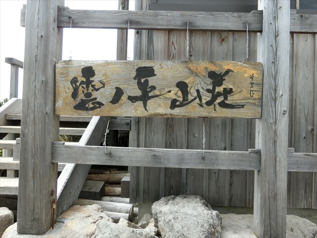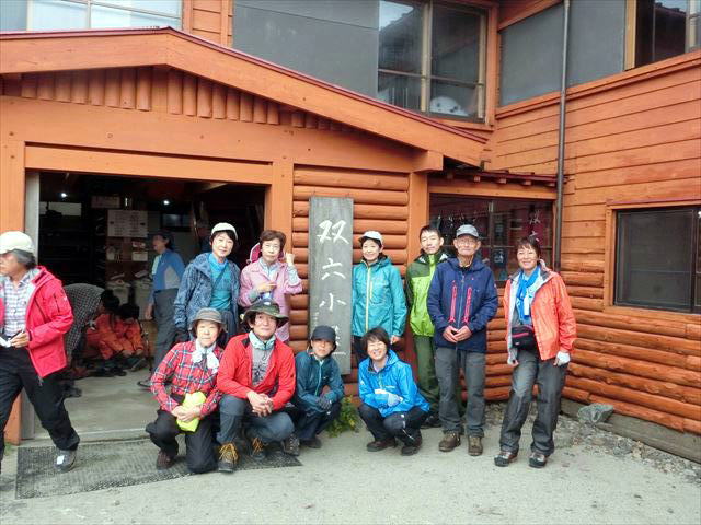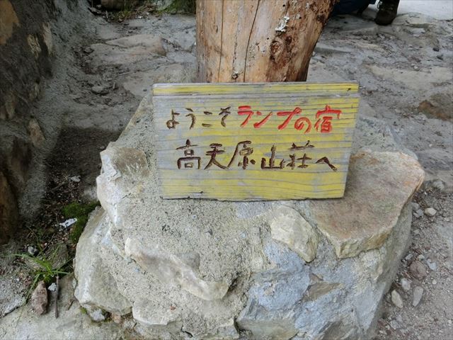 小屋の看板は、花の百名山の著者、田中澄江書。コバイケイソウが双六岳を代表する花として選ばれている