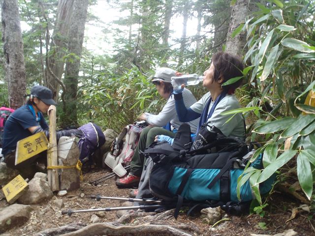 五光岩ベンチまでもう少しのところで女性の一人Sさんが両足、ついでふとももの内側までもつる事態になってしまいました。薬をのんだり塗ったりと処置を色々したのちみんなでSさんの荷物を分け合って再出発。無事全員で太郎平小屋に到着!