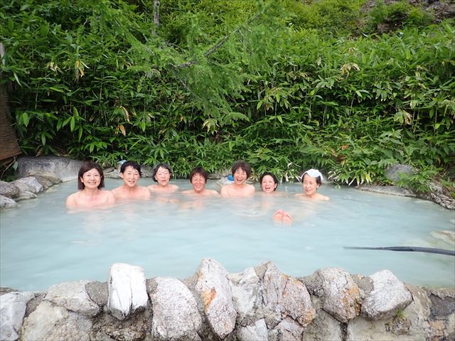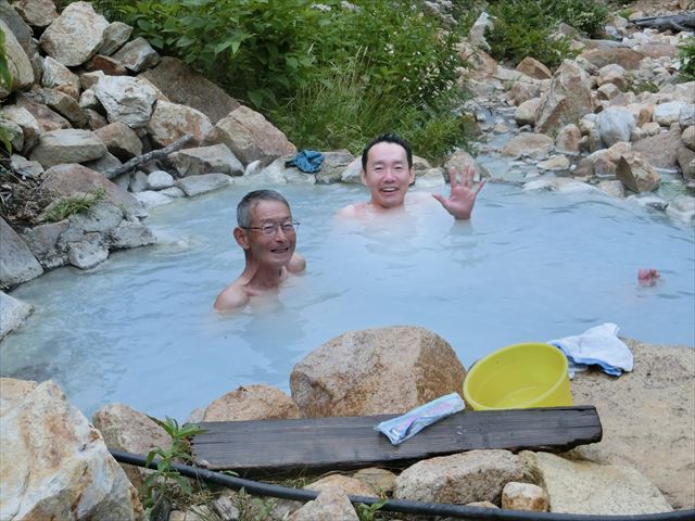白く白濁した単純硫黄泉で女性専用のほか混浴と川の中の野湯があり、お湯の温度は熱くもなくぬるくもなく疲れがとれる良い温泉でした。ただ山荘までの帰り道は緩いのぼりを30分歩くのですが・・・2日目の道程はとても変化に富み、天気にも恵まれ素晴らしい一日になりました。(コメント:Ei.O)