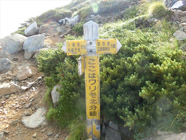 19日(月) 高天原山荘出発 4:00 - 水晶池分岐 5:00 - 岩苔乗越 7:30 - ワリモ北分岐 8:00 - ワリモ岳 8:30 - 鷲羽岳 9:07 - 三俣山荘 10:45 - 三俣蓮華岳 12:15 - 双六岳 14:05 - 双六小屋 15:10(泊)