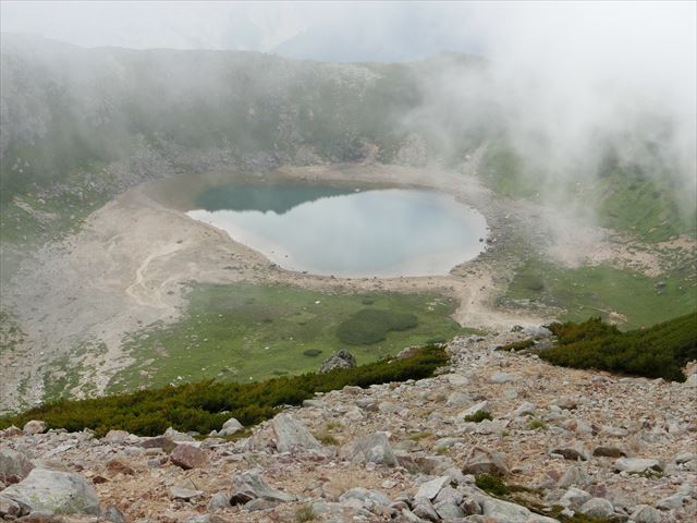 三俣蓮華岳に着いた時は、残念、周りは全く眺めることはできなかった。三つ目の双六岳も周りは、眺めることはできなかった。広い平らな所をしばらく歩き、本日泊まる双六小屋目指して下る。