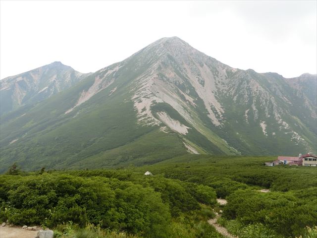 足を滑らせないよう三俣山荘まで下る。途中から目指す山荘が見えてくる。山荘で休憩と水補給をして出発。登り始めて間もなくぽつりぽつりと雨が当たる。ザックカバーだけでも、とつけ始めると雨足が速くなる。