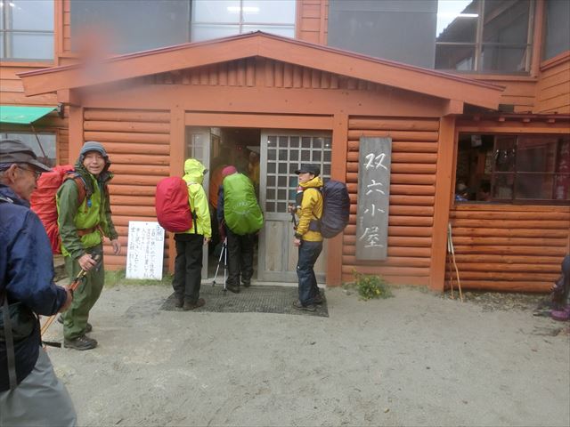鏡平小屋に着き、かき氷を食べる人、トイレに行く人など、降り出した雨も一時止み休息した。