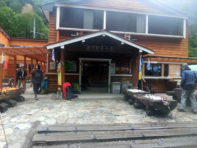 最後の小屋、わさび平小屋目指して下っていく。小屋ではトイレ休憩だけしてゴールの新穂高温泉目指して歩く。さらに、2時間近く平らな道を歩く。これから温泉やその後の飲み物、食べ物を思い浮かべながら歩くと不思議に元気が出た。到着!汗と雨でぬれた洋服。疲れた体を温泉でさっぱり。