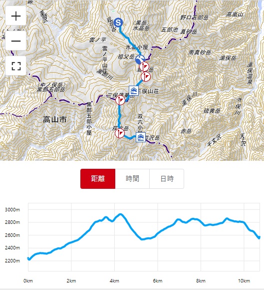 20日(火) 双六小屋出発 5:50 - 弓折岳分岐 7:05 - 鏡平山荘 7:47 - わさび平小屋 10:47 - 新穂高温泉着 11:53
