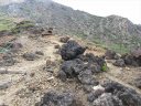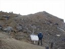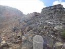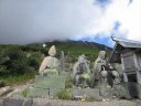 登山道には山頂に近づくにつれ噴石・火山灰・壊れた小屋・石像などが目に付き、黙祷。