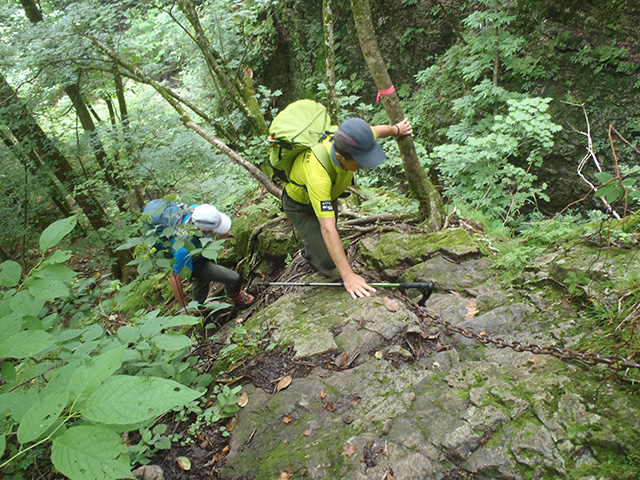 北鎌のAリーダーの七滝沢コース(破線コース)で登ろうの一言で、『秋の日帰り強化合宿』になりました。しかし七滝沢コースは、下りでは使わない方が安全と思えるほど、急登でとても良いトレーニングになりました。今回は山頂でも雨具を着ない山行でした。
