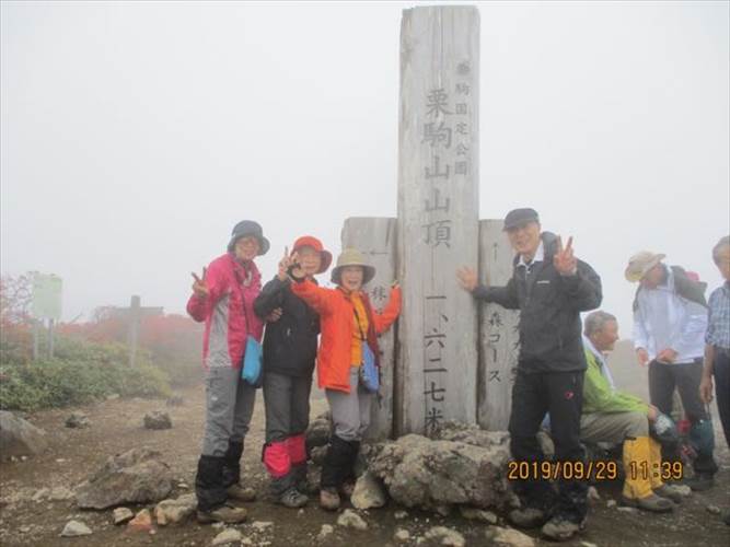 栗駒山山頂、ガスが出て来ました。風を避けて昼食