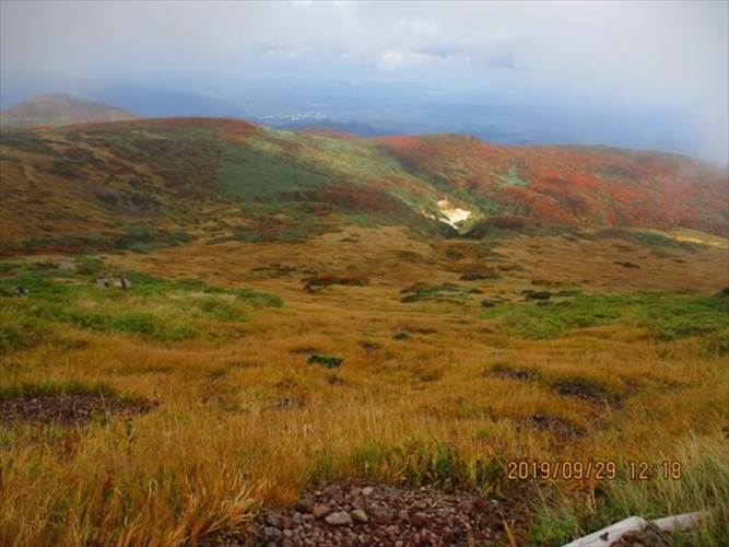 草原に人も見えます。白い部分は雪渓でしょうか?