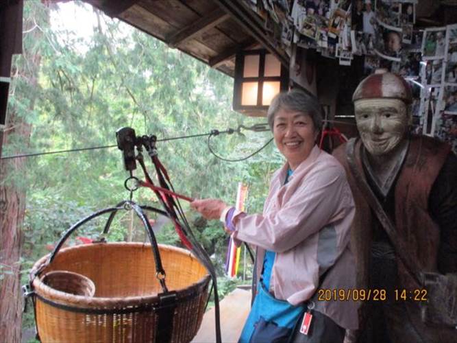 籠を引き上げる体験をしたSさん。隣の像は初代の方とか。