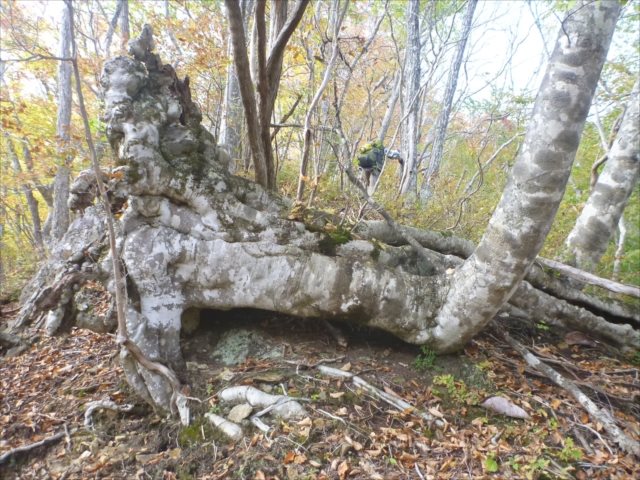 倒れたブナの枝が根付いて高木が