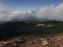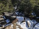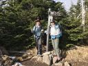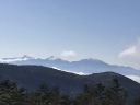 車中から、青空の下、蓼科山のまあるい山頂がハッキリ見えていたので、晴天を期待して登山開始!登山道には既に雪が積もっていたので、軽アイゼンを持参しなかったのがちょっと心配・・・。ですが、まずは茶臼山(2,384m)を目指します。途中の中小場では、眺望が良く、うっすらと雪を被った山々が見渡せました。大きな岩ゴロの少々キツイ道を登り終わると、茶臼山到着!ここで単独の男性に会い(この山行で出会った唯一の登山者でした)、近くの展望台を勧められたので行ってみました。なるほど良い展望でしたが、強風だったのですぐに戻りました。その後ゆるく下り、また途中の別の展望台に寄って、縞枯山山頂に到着!山頂は展望がなく、ちょっとスペースがあるだけでした。雪のない場所を見つけて、ここで昼食をゆっくりとりました。あとは雨池までの下りですが、これが結構急坂で、雪が積もった道を滑らないように注意して歩くのは少々疲れました。