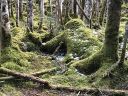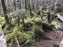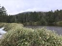 雨池は、地図で見ると近くにある人気の白駒池より少し小さく、とても静かな池でした。池からは、さっき登ってきた縞枯山山頂はガスで見えず、ほとりには、やはり縞枯模様の木々が立ち並んでいます。曇っているせいか、ちょっと寂しい感じがしました。西岸から時計回りで池を4分の3周して、八ヶ岳名物(?)のコケを鑑賞しながらゴールに到着~!