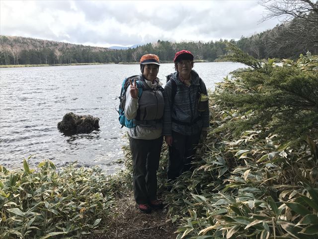 池をバックにパチリ! 約1名着ぶくれ(;^_^A