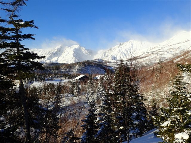 栂池ヒュッテ、山荘とバックは白馬三山・大雪渓