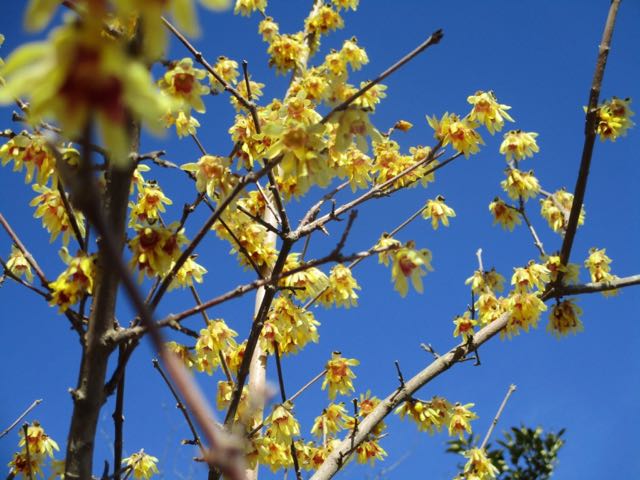 青空に映える。この蝋梅は芯が赤い