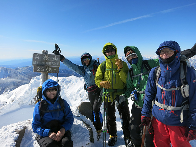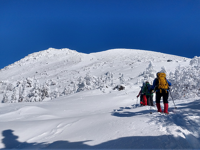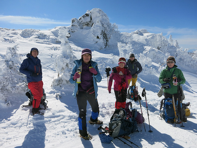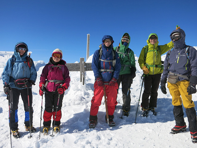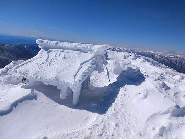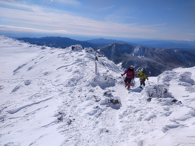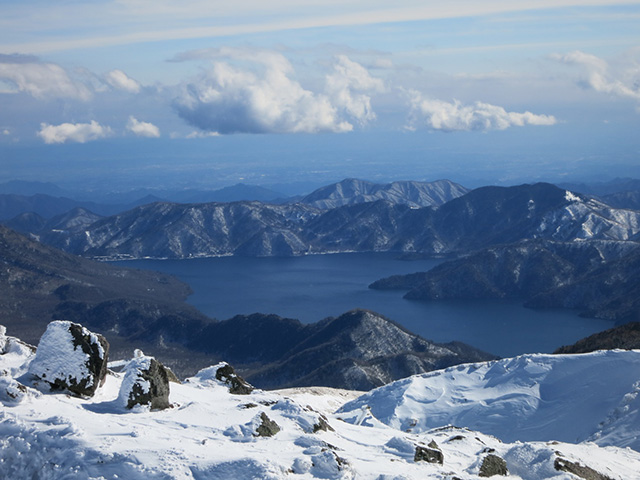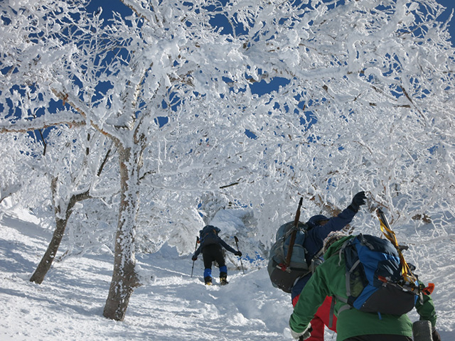 一月の個人山行の黒檜山が終わった時から、2月は日光白根に決めていた。M.Sさんから日光白根のリベンジのお誘いを頂き、ありがたくご一緒した。 丸沼高原スキー場のロープウェイを降りて、二荒山神社の鳥居をくぐり抜けていよいよスタート。七色平避難小屋への分岐でアイゼンを装着した後、山体を左回り気味にトラバースしながら登り進み、やがて道が山の北面から東面に変わるころ見事な樹氷のトンネルが現れて、さらに進むと森林限界に到達したのちにパッと視界が開けて頂上が目前に迫る。小休止の後、30分かけて山頂へと到達した。二等三角点のある山頂からは、中禅寺湖、男体山、会津駒ケ岳、燧ケ岳、至仏山、武尊山、谷川岳、皇海山が確認できて360°の素晴らしい展望でした。残念ながら富士山はカスミがかって見えませんでしたが、天気も良く風も程々でホントに最高でよかったです。