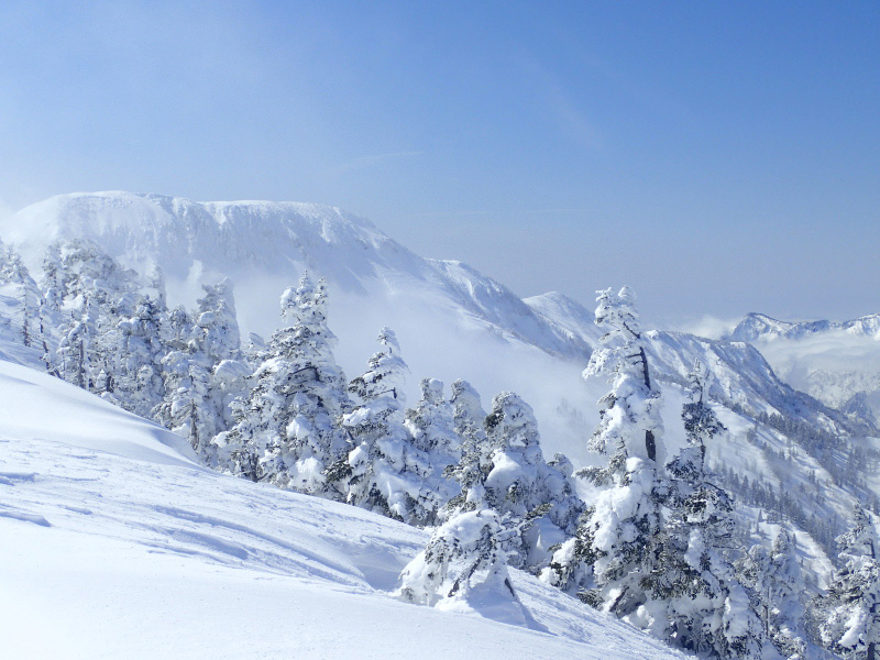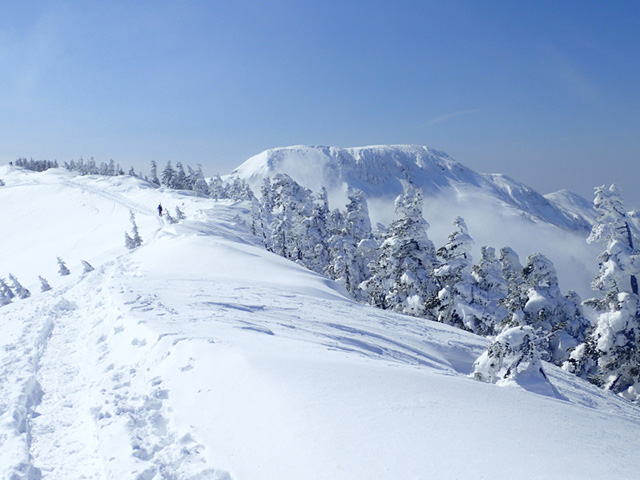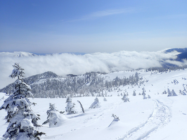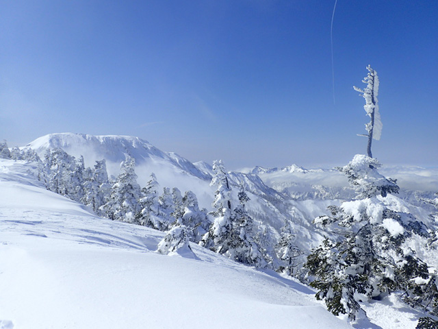 ガスがはれ、風もなく絶好の登山日和である。積雪2m以上はあろうか、さすがにどこも雪不足のなか、この地域だけは十分にあり2日前に降った雪が15㎝程積もっていた。あっという間に苗場山と小松原方面の分岐点に達し、神楽ヶ峰山頂からの稜線に出た。山々は見渡す限りの新雪で美しく綺麗に輝いていた。