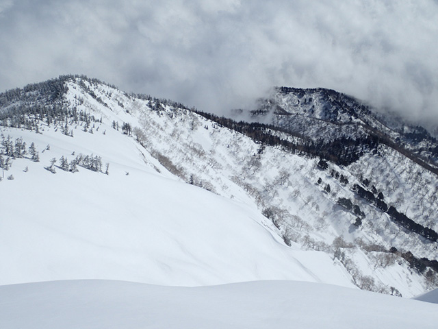 山頂付近は風と気温でガリガリ、少し下るも今度は雪面が固く最中状になっていて思うように曲がれない。3年前のスキー合宿では快適に滑れた斜面もバタバタであった。 目指す反射板方面への東面の林の中のトラバースは気持ち良かったものの、反射板からの期待していた大斜面は南面のため悪雪そのもの、まともに滑れず斜滑降、ボーゲンUターンの繰り返しで下へ下へ。