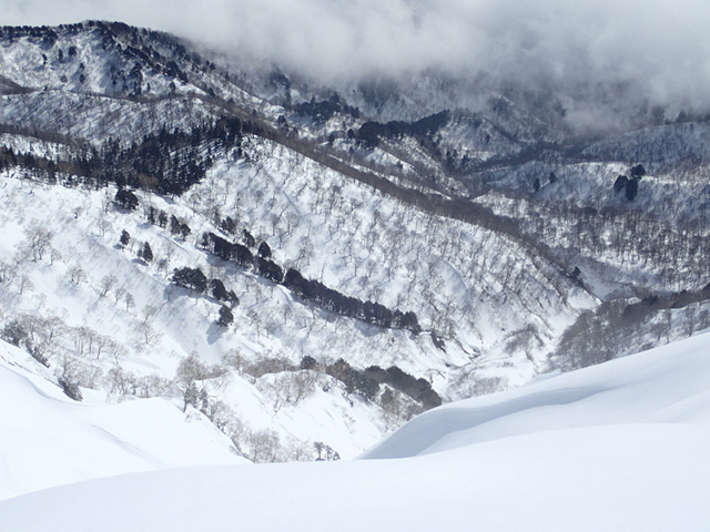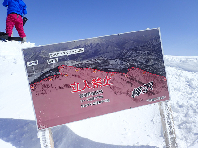 神楽ヶ峰山頂でゆっくりと昼食をとり、昨年山スキー仲間が下降し遭難騒ぎとなった棒沢を覗き、立ち入り禁止看板のもと、改めて地形を確認した。