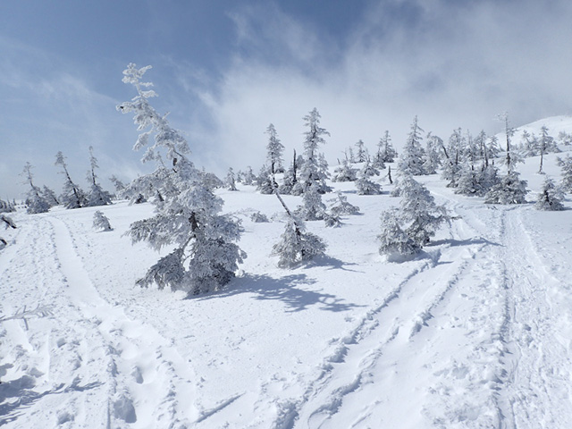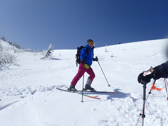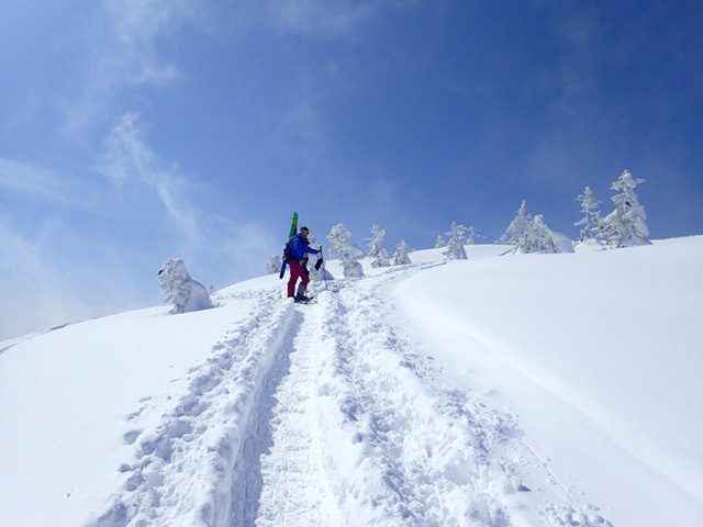 やはりスノーシューよりシールでの登行の方が圧倒的に早くKさんは稜線上遥か向こうを歩いている。