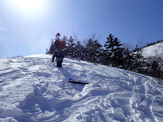 一旦、中尾根下の沢沿いに和田小屋へ滑走し、再び登り返して計画書を提出しビーコンを装着して歩き始めた。Kさんはシールで、IさんとAはスノーシューでの登行である。