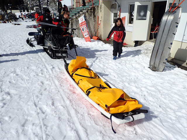 動けないので救急隊員とスノーボートの世話になり診療所へ、応急処置を