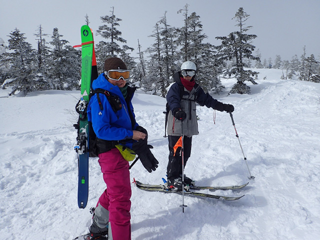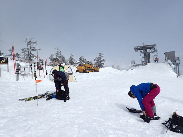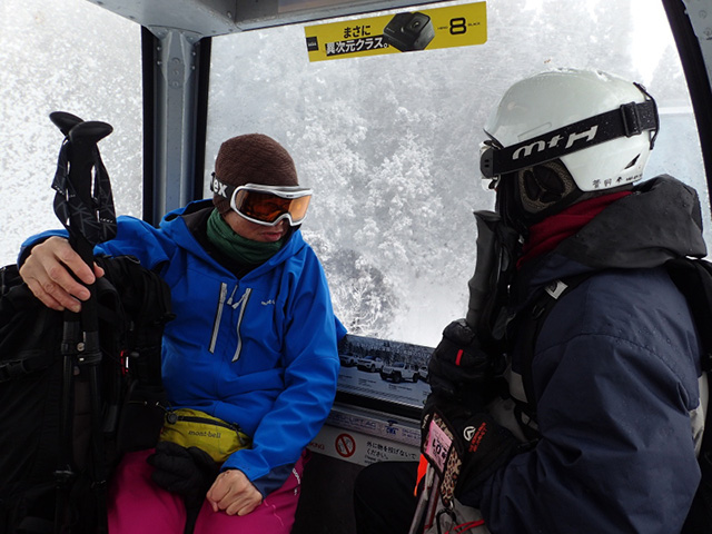 Aさんは宿にて休養、合宿は3名で予定通りとし神楽スキー場へ、ロープウェイ、リフトさらにゴンドラとリフトを乗り継ぎチェックポストへ到着するがガスっているので待機となった。