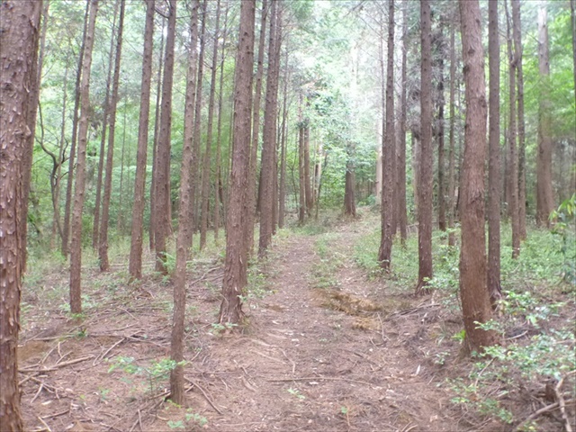 軽トラ轍跡が針葉樹植林に延びる
