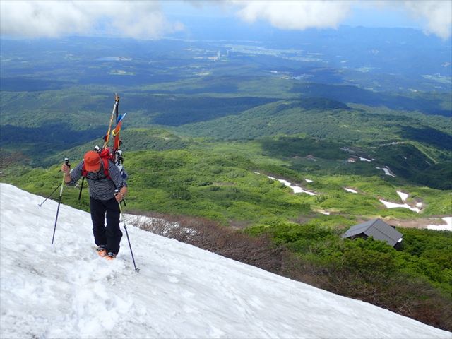 七ツ釜避難小屋の脇を抜けて雪渓をトラバースしていきます
