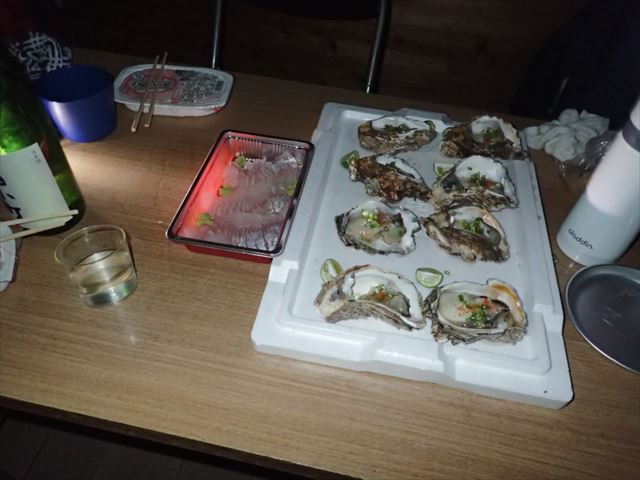 象潟で仕入れた「岩ガキとクエ、アジの刺身」、料理人が一緒ですから