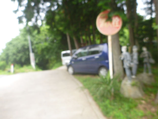 愛宕山登山口の目印は黄門様ご一行人形と消火栓看板・ピンぼけお許しあれ
