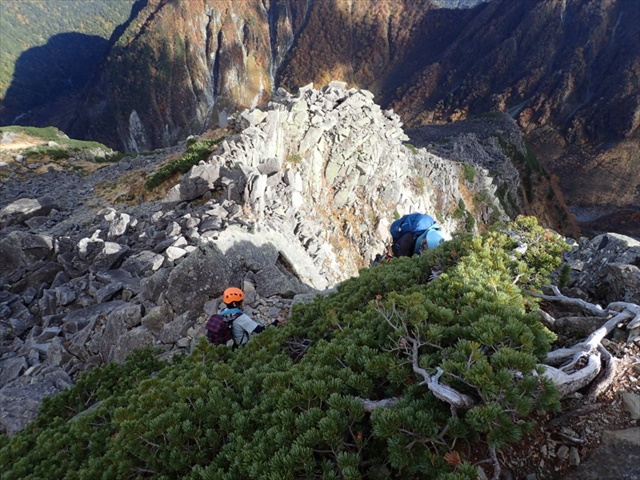 ハイマツと岩とのミックス稜を登っていきます
